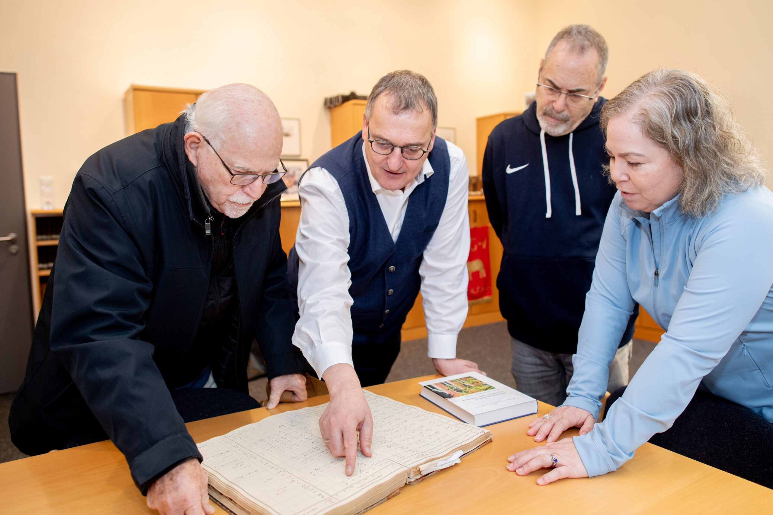 Am Montag durften wir schließlich Familie Meyberg bei uns an der Schule begrüßen. Nach einem kleinen Empfang bei unserem Schulleiter ging es zu unserem Schuldenkmal für die ehemaligen jüdischen Schüler unserer Schule – darunter auch Julius Meyberg, der zusammen mit seiner Mutter Fanny im Holocaust ermordet wurde. Das Denkmal wurde von Heinz Gode, früher Kunstlehrer am AGO, gestaltet. Nach der kleinen Schulführung blieb noch Zeit für einen gemeinsamen Austausch – auch über den Erinnerungsgang, der im kommenden Jahr von unserer Schule vorbereitet wird.