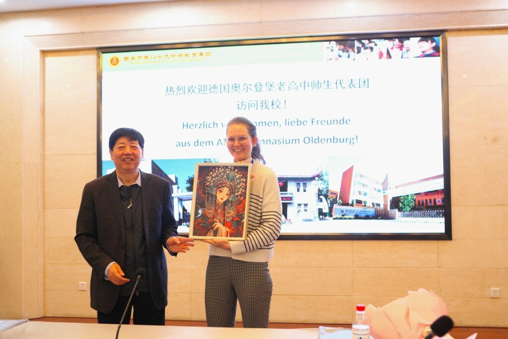 Im Rahmen des von der Stadt Oldenburg initiierten China-Programms legten sie und die zwei begleitenden Lehrkräfte, Maren Bischoff und Saskia Rolle, in zwei Wochen knapp 18.700 km mit Flugzeug, Bus und Nachtzug zurück und besuchten gleich drei bekannte Städte: Shanghai, Xi‘an und Peking. Kein Wunder, dass da das ein oder andere Gähnen auf den vielen Gruppenfotos beim spektakulären Empfang an der Partnerschule, der Mittelschule Nr.89 in Xi’an, zu erkennen war. Dort wurden wir überschwänglich begrüßt, mit Lobreden der Schulleitung und der Betonung unserer mehr als 11jährigen Freundschaft.